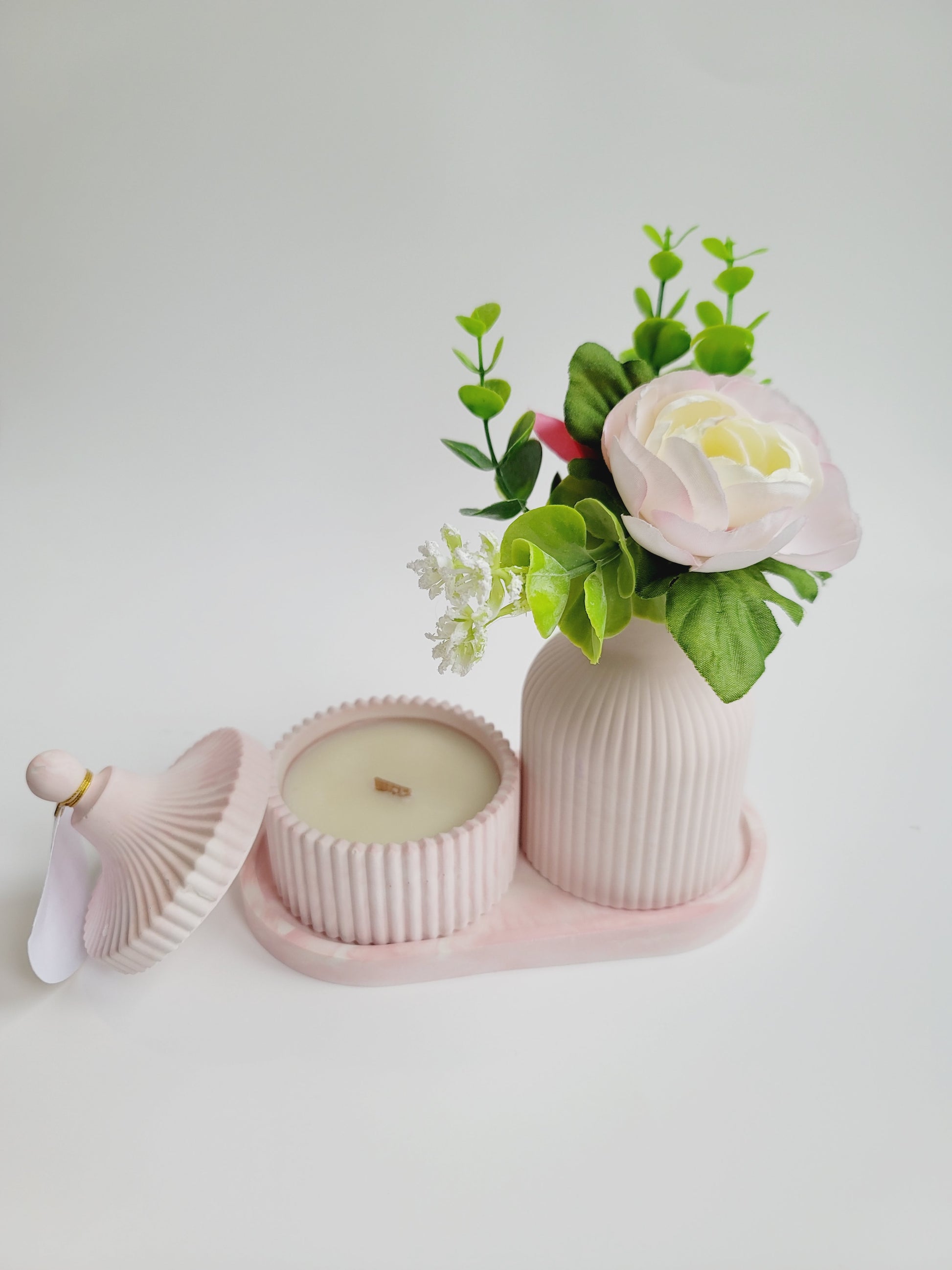 Cement Table Decor Candle Set - With Floral Vase - Pink